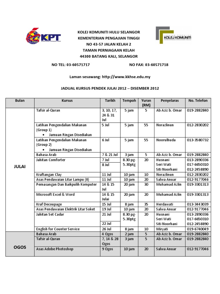 Takwim Kursus Jangka Pendek Pembelajaran Kolej Komuniti Hulu Langat Facebook
