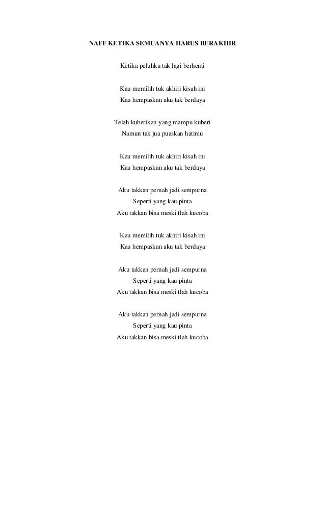 Lirik lagu dan tak seharusnya aku. Dan ku tersandar begini meratapi hati yang telah dilukai. Berikut cuplikan syair nyanyian teks lagunya aku terluka tak bisa dapatkan kau sepenuhnya aku terluka melihat kau bermesraan dengannya aku terluka tak bisa dapatkan kau sepenuhnya harusnya yang kau pilih bukan dia ooooh. Apakah kau cuba untuk menafikan keikhlasan hatiku padamu betapa ku mencuba mendapatkan secebis kasihmu. Dan tak seharusnya aku bertemu dirimu di dunia ini dan kau membuang diriku sesuka hatimu dan memilih dia.